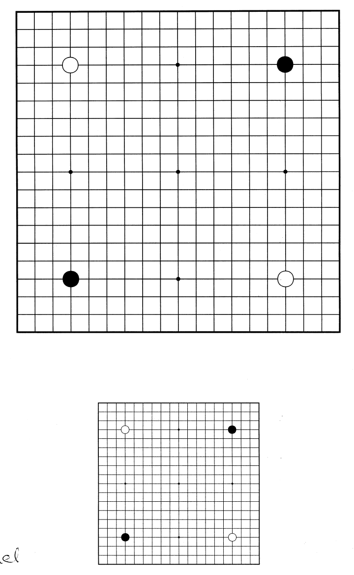 Obrázek 1: (deska 19x19 se dvěma černými a dvěma bílými kameny na hvězdách - bez popisu)